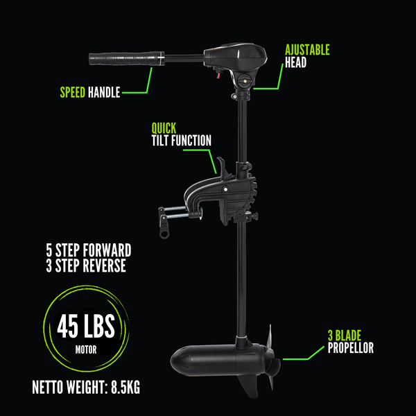 Pro Line – Trolling Motor 45LB – Black De Pro Line Trolling Motor 45LB Black is speciaal ontwikkeld voor de moderne karpervisser die betrouwbaarheid en controle zoekt op het water. Deze elektrische fluistermotor is perfect te combineren met de Pro Line Commando botenen biedt precies de juiste balans tussen kracht en wendbaarheid.Met een 45LB trekkracht is deze elektromotor ideaal voor gebruik op kanalen, plassen en kleinere tot middelgrote wateren. Dankzij de korte shaft is hij perfect afgestemd op compacte (rubber)boten en voerboten.Belangrijkste kenmerken45LB trekkracht – krachtige en stabiele voortstuwingKorte shaft – ideaal voor compacte botenBatterij-indicator – direct inzicht in je accuniveauWeedless propeller – minder vastlopen in wier en begroeiingBetrouwbare en stille werkingDe weedless propeller zorgt ervoor dat je probleemloos kunt varen in wateren met veel planten of wier. De geïntegreerde batterij-indicator voorkomt verrassingen tijdens lange sessies, zodat je altijd weet hoeveel capaciteit je nog hebt.Waarom kiezen voor de Pro Line 45LB?Speciaal ontwikkeld voor karpervissersPerfecte match met Pro Line Commando botenIdeaal voor kleinere tot middelgrote waterenBetrouwbaar, stil en gebruiksvriendelijkEen uitstekende keuze voor wie gecontroleerd en geruisloos wil manoeuvreren tijdens het karpervissen.
